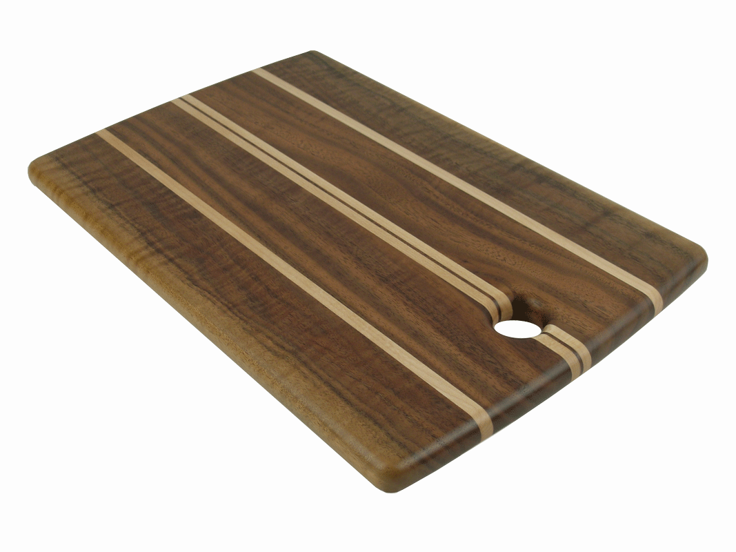Intended to complement the work of fine cooks and hosts, these cutting boards were designed to serve the needs of everyday and special occasion dining. Perfect for cutting, chopping or other cooking tasks, they can also be used as serving trays, an ideal companion to fine breads, cheeses and other hors d'oeuvres. Meticulous surface preparation, durable hardwoods, waterproof adhesives, and hand-rubbed food grade finishes are standard features of each board. Exotic and domestic woods of varying colors, textures, and grain patterns can be arranged in endless compositions to create sleek surfaces that will enhance any presentation and provide years of daily service.