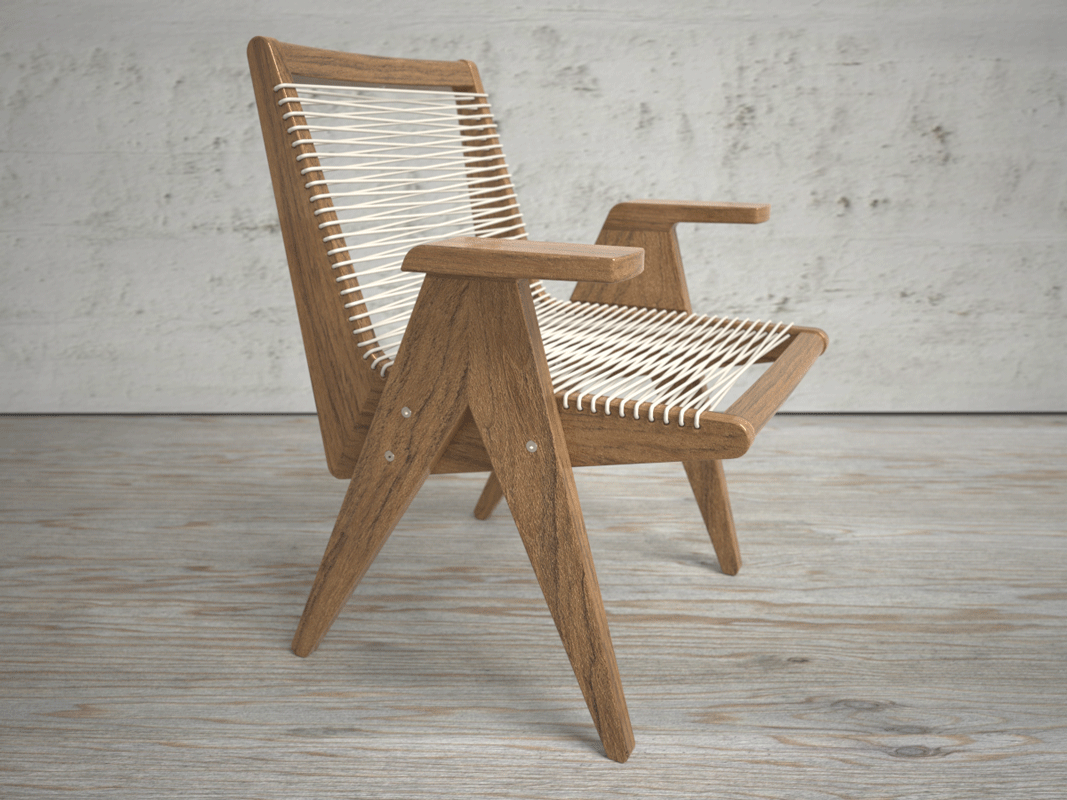 A corded teak dining arm chair designed for outdoor use. Also available with a suplementary seat and back cushion. The all-weather cording is reinforced with a monofilament to resist stretching and permanent deformation. One of a larger collection consisting of additional dining and lounge seating, dining, coffee and side tables.