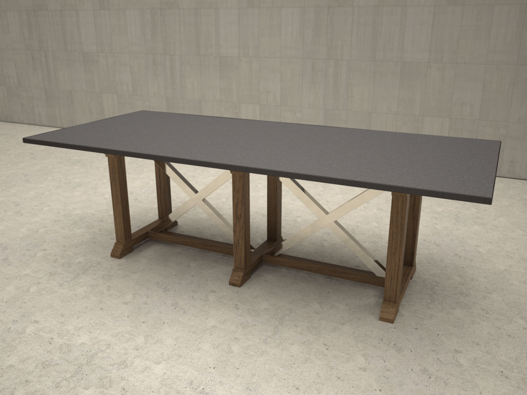 This dining table is part of a collection of dining, lounge and poolside seating and tables. Designed for outdoor use, it is manufactured from teak, polished aluminum, and a flamed granite top with honed edges.